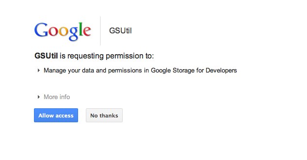 $ dart/third_party/gsutil/20110627/gsutil config This script will create a boto config file at /Users/administrator/.boto containing your credentials, based on your responses to the following questions. Please navigate your browser to the following URL: https://accounts.google.com/o/oauth2/auth?scope=https%3A%2F%2Fwww...(略) In your browser you should see a page that requests you to authorize gsutil to access Google Storage on your behalf. After you approve, an authorization code will be displayed. Enter the authorization code: