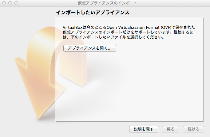 アプライアンスを開くでダウンロードしてきた ova ファイルを読み込む